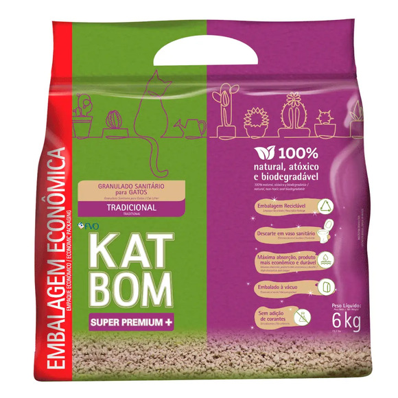 Areia para Gato Katbom Natural Granulado HigiênicoA Areia para gato Katbom Natural Granulado Higiênico é um granulado sanitário atóxico, biodegradável e 100% natural, sendo a melhor opção para a preservação do meio ambiente.O Granulado Natural Katbom absorve a urina instantaneamente, formando torrões antes que os odores se desenvolvam evitando a proliferação de bactérias. Por ser natural e a base de matéria orgânica, os torrões podem ser descartados no vaso sanitário sem problemas de entupimentos.Além disso, a sua embalagem conta com a tecnologia patenteada Nano Pack, sendo completamente reciclável. A Areia Katbom é desenvolvida para a higiene dos gatos e a melhor opção na preservação da qualidade ambiental.Areia Katbom – ComposiçãoFarinha de cereais processada, agente aglutinante.Areia Katbom - Modo de usarSegundo o fabricante, o modo de usar de areia para gato Katbom é: 1. Despeje o granulado Katbom na bandeja para formar uma camada de aproximadamente de 5cm.2. Remova os torrões de urina e as fezes em um intervalo de aproximadamente 12 horas.3. Descarte no vaso sanitário. Em caso de torrões maiores, recomenda-se quebrá-los antes.4. Complete os vazios formados na caixa com granulado e substitua completamente o conteúdo da caixa a cada duas semanas.Areia Katbom – Recomendaçõesjamais misture outros granulados ou tipo de produto ao granulado Katbom.proteja o produto contra insetos e umidade.conserve o granulado Katbom em local seco e arejado.Areia Katbom – ApresentaçãoA Katbom está disponível em embalagens com 3kg e 6kg.Areia Katbom com preços especiais é na A areia para gatos é um item essencial para qualquer casa com felinos. Na , você encontra a Areia Katbom Natural com preço especial e as melhores opções de itens de higiene para gatos. Aproveite nossas promoções e agende agora mesmo a entrega do seu pedido com a nossa Compra Programada.