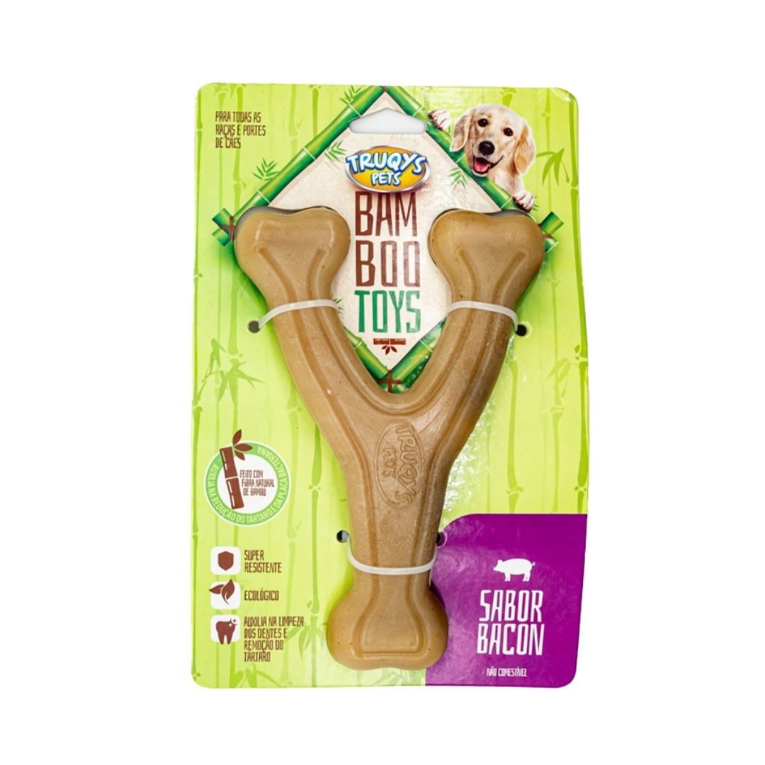 DESCRIÇ.Ã.O: O Osso Forquilha Bamboo Toys da Truqys é. um brinquedo mordedor 2 em 1, que divertirá. seu pet e o ajudará. a manter a saú.de bucal em dia. Seu dogo vai amar, pois conté.m um sabor delicioso e a mastigaç.ã.o do brinquedo aliviará. o stress e a ansiedade do dia a dia, reduzirá. os incô.modos nos dentes e evitará. que o seu bichinho fique mordendo seus mó.veis, chinelos e sapatos. CONTEÚ.DO: .01 unidade de brinquedo. INDICAÇ.Ã.O: Para todos os cã.es de raç.as e portes. DIMENSÕ.ES: .Tam. P: 13cm de altura / 9cm de largura (recomendado para cã.es de até. 10kg). Tam. G: 20cm de altura / 11cm de largura (recomendado para cã.es de até. 25kg). MATERIAL: Fibra de Bambu, Nylon ató.xico e aromas naturais. MARCA: Truqys. CUIDADOS: Nenhum brinquedo é. 100% indestrutí.vel. O objetivo dos brinquedos é. entreter seu animal. Mordê.-lo faz parte de seu instinto, por isso nã.o fique chateado caso seu pet destrua algum deles. Nã.o deixe seu bichinho com o brinquedo novo sem supervisã.o. É. importante estar presente até. saber qual a sua reaç.ã.o com o produto.