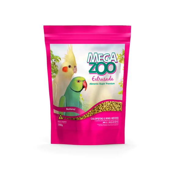Ração Extrusada Megazoo para Calopsitas e Ring NecksA Ração Extrusada Megazoo para Calopsitas e Ring Necks é um alimento completo especialmente formulado para atender as necessidades nutricionais de aves ornamentais como calopsitas, ring-necks, roselas, agapornis e outros psitacídeos durante os períodos de manutenção e muda.Desenvolvida para atender as necessidades destas aves, a Ração para Ring Neck proporciona uma nutrição rica em nutrientes para mantê-los saudáveis e vibrantes em todas as fases da vida.Na você encontra a maior variedade de alimentos para seu pet como a Ração Extrusada Megazoo para Calopsitas e Ring Necks com preço especial. Compre pelo site, app ou em uma de nossas lojas.Modo de usoFornecer à vontade como única fonte de alimentação ou com, no máximo, 25% de vegetais e cereais. Quando o alimento for oferecido pela primeira vez, é fundamental que se faça um período de adaptação, misturando este produto à alimentação habitual na seguinte proporção:Dia 1 – 5: ¼ Megazoo ¾ alimentação habitualDia 6 – 12: ½ Megazoo ½ alimentação habitualDia 13 –17: ¾ Megazoo ¼ alimentação habitualDia 17 adiante: 100% Megazoo.Para aves que apresentam maior dificuldade de se adaptarem ao novo alimento, pode-se estender esse prazo (especialmente a primeira e segunda fase) por até 40 dias.IngredientesMilho integral moído*, arroz, aveia integral, soja integral extrusada*, farelo de soja*, farinha de atum, plasma sanguíneo (fonte de imunoglobulinas), extrato de levedura (fonte de nucleotídeos), ovo desidratado, semente de linhaça, farelo de trigo, levedura seca de cerveja, polpa de beterraba, fosfato bicálcico, calcário calcítico, óleo de soja refinado*, óleo de palmiste, óleo de salmão, coco ralado, farinha de alga (Schizochytrium sp), premix vitamínico mineral aminoácido (aditivos adsorventes de toxinas, extrato de cardo-mariano, DL-metionina, vitamina A, vitamina D3, vitamina B1, vitamina B6, vitamina B2, vitamina B12, vitamina C, vitamina E, vitamina K3, niacina, cloreto de colina, ácido fólico, pantotenato de cálcio, biotina, inositol, zinco aminoácido quelato, sulfato de cobre, cobre aminoácido quelato, iodato de cálcio, monóxido de manganês, manganês aminoácido quelato, sulfato de zinco, sulfato de cobalto), cloreto de sódio, aditivo fungistático, mananoligossacarídeos, beta-glucanas, ferro quelatado, levedura enriquecida de selênio, beta-caroteno, luteína, probióticos, DL-metionina, corante natural de cúrcuma, aditivo flavorizante, aditivo antioxidante natural à base de extrato de alecrim (0,1%).* Milho geneticamente modificado por Streptomyces viridochromogenes, Bacillus thuringiensis e Zea mays. Soja geneticamente modificada por Agrobacterium tumefaciens.Ingredientes fixos sem eventuais substitutivos.Níveis de GarantiaUmidade (máx.)110 g/kgProteína bruta (mín.)150 g/kgExtrato etéreo (mín.)45 g/kgMatéria fibrosa (máx.)35 g/kgMatéria mineral (máx.)70 g/kgCálcio (máx.)11 g/kgCálcio (mín.)9.000 mg/kgFósforo (mín.)5.500 mg/kgSódio (mín.)2.100 mg/kgMananoligossacarídeos-mos (mín.)400 mg/kgBeta-glucanas (mín.)450 mg/kgÔmega 3 (mín.)2.600 mg/kgMananoligossacarídeos-mos (mín.)400 mg/kgBeta-glucanas (mín.)450 mg/kgSaccharomyces cerevisiae (mín.)1,0 x 105 ufc/kgEnterococcus faecium (mín.)5,0 x 103 ufc/kgLactobacillus acidophilus (mín.)5,0 x 103 ufc/kgAditivos adsorventes de toxinas (mín.)1.000 mg/kgExtrato de cardo-mariano (mín.)0,50 mg/kgDL-metionina (mín.)4.500 mg/kgEnriquecimento Mínimo por KgVitamina A (8.000,00 UI), beta-caroteno (8,00 mg), vitamina D3 (1.300,00 UI), vitamina E (120,00 UI), vitamina K3 (3,00 mg), vitamina C (80,00 mg), ácido fólico (2,00 mg), pantotenato de cálcio (35,00 mg), cloreto de colina (1.500,00 mg), vitamina B6 (6,00 mg), vitamina B1 (6,00 mg), vitamina B2 (10,00 mg), vitamina B12 (80,00 mcg), niacina (55,00 mg), biotina (0,30 mg), inositol (60,00 mg), cobre (7,00 mg), cobre quelatado (3,00 mg), cobalto (0,15 mg), iodo (1,10 mg), ferro quelatado (19,50 mg), manganês (35,00 mg), manganês quelatado (15,00 mg), zinco (60,00 mg), zinco quelatado (30,00 mg), selênio orgânico (0,45 mg).